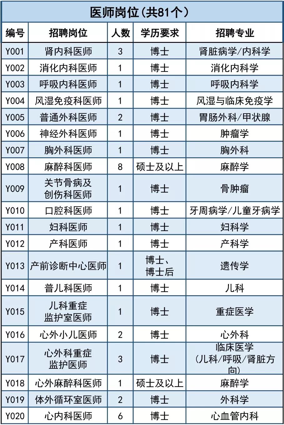 (1)医师岗位:要求为博士研究生学历,并获得相应学位,第一学历要求为「双一流」建设学科或「985」、「211」工程重点建设高校毕业,或相应专业本科教育排名进入中国大学本科教育排行前 20 名。紧缺专业如超声科、儿科、妇产科、病理科、全科医学、精神医学科、麻醉科等可考虑招聘硕士研究生。