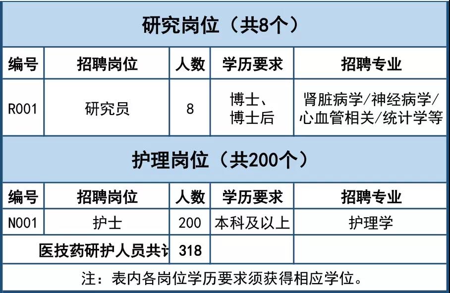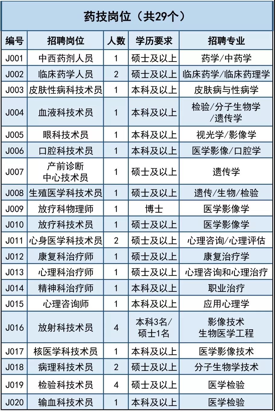 (3)技、药岗位:要求为全日制本科及以上学历,并获得相应学位。其中,临床药学岗位要求硕士及以上研究生毕业,第一学历要求与医师岗位相同。