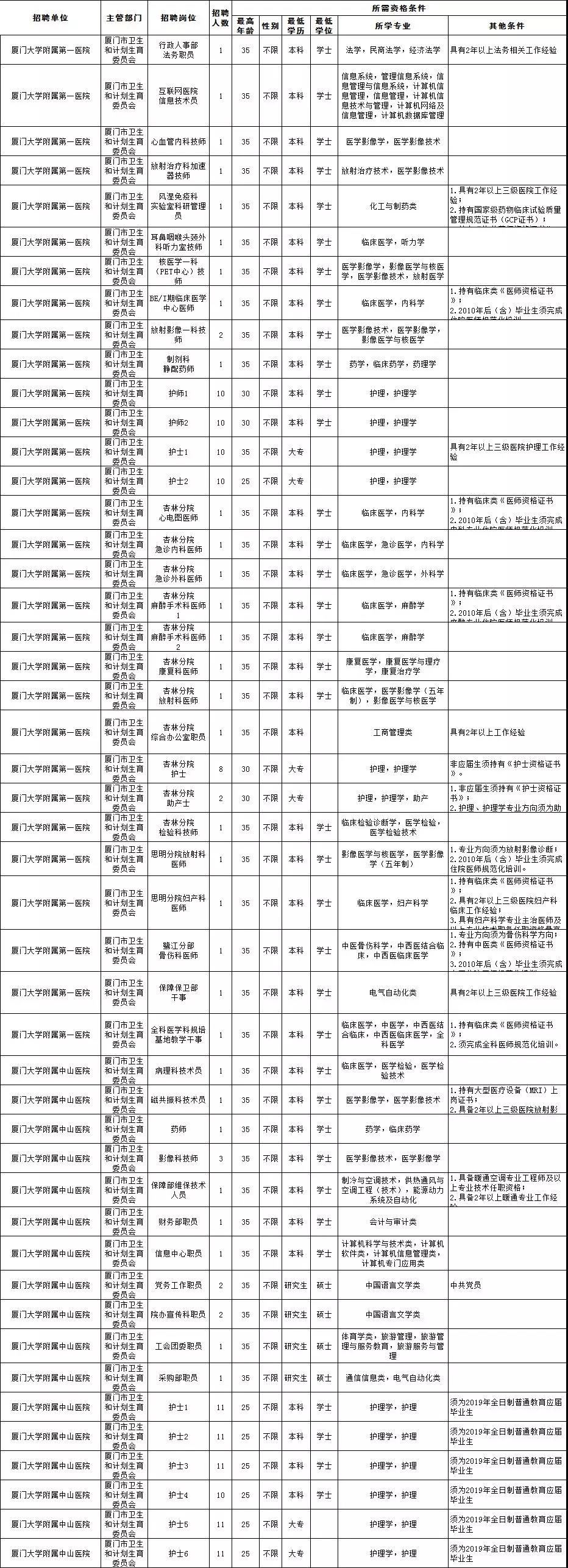 厦门大学附属心血管病医院是一所国家重点大学研究型附属医院,五缘湾新址是市委、市政府为民办实事重点工程,预计2019年5月整体搬迁。因医院业务发展需要,此次面向社会公开招聘工作人员89名。