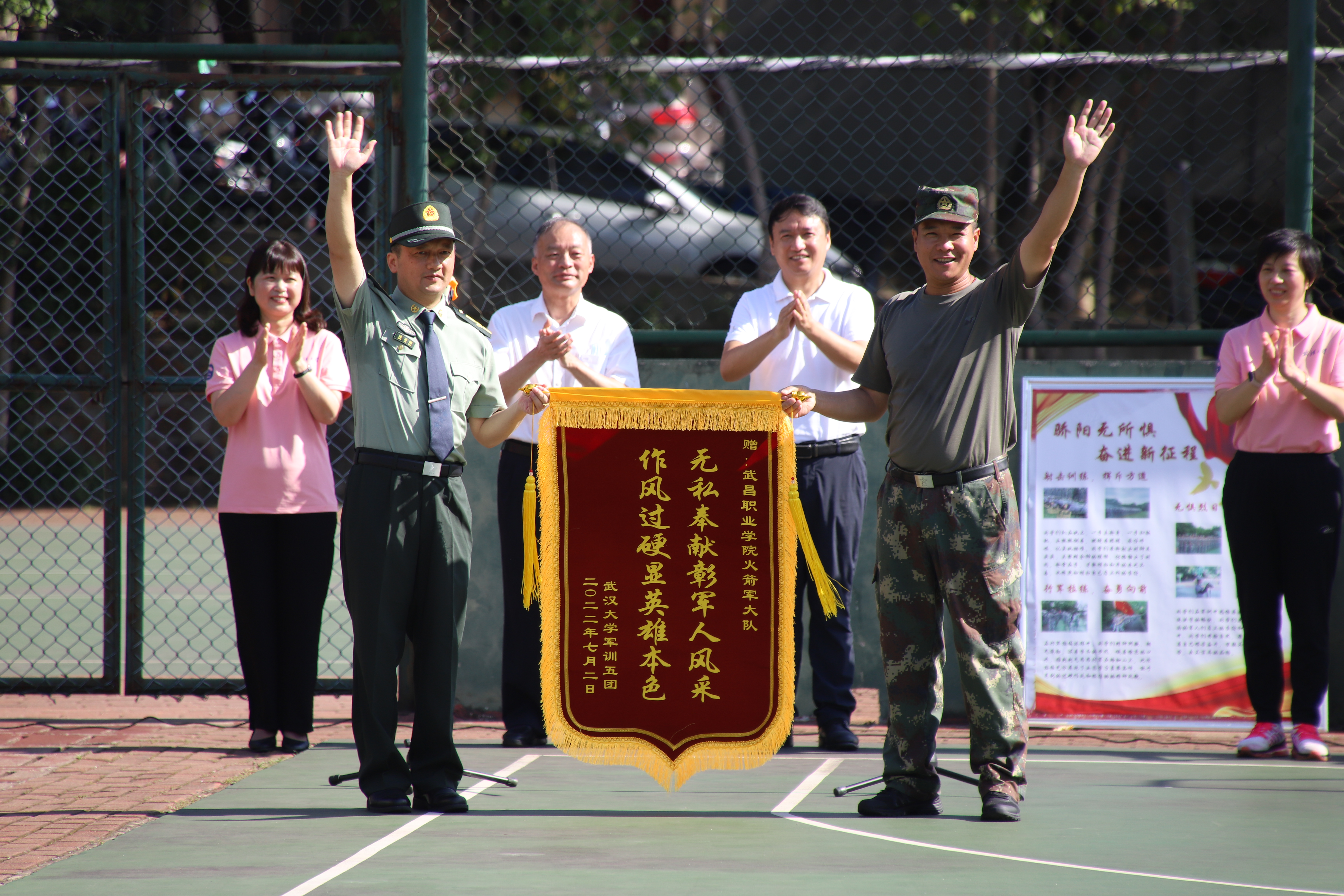 最后,由军训五团政委边志国向武昌职业学院火箭军大队方旭东团长赠锦旗。
