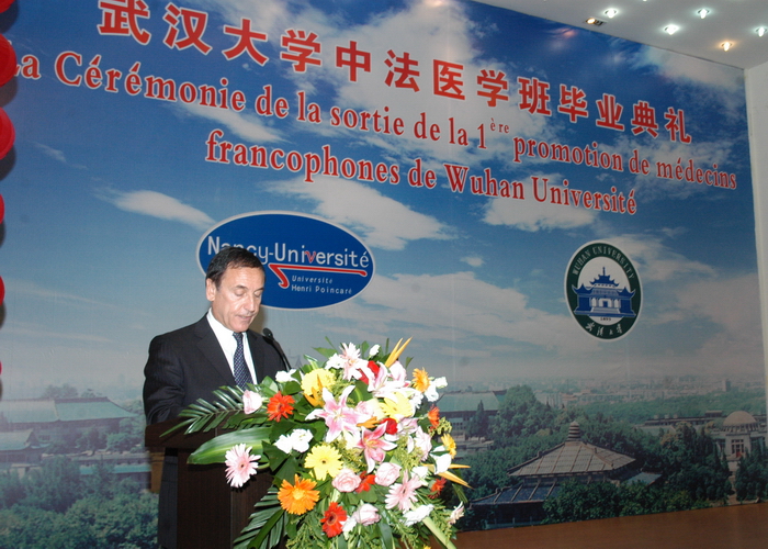 周云峰部长和法国亨利.庞卡莱大学教授、法国科学院院士Stolts教授亲自为共同培养的首届七年制医学生颁发硕士学位。法国驻武汉总领馆费勇领事高度评价Av解说