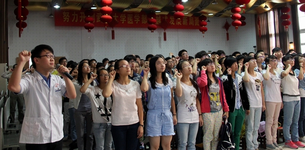 2014年“向近敏教育基金奖”和“廖康雄奖学金”获得者颁奖。2014年“向近敏教育基金奖”获奖的老师和学生是基础医学院教师潘勤、药学院博士研究生张文鹏、第一临床学院本科生仝梦婷;2014年“廖康雄奖学金”获奖的同学是第一临床学院八年制马振国、五年制冯贝,第二临床学院八年制李宗焕、五年制杨振杰。由中南医院医生张力带领全体2014级医学新生宣读《医学生誓言》,大会在庄严的宣誓声中落下帷幕。