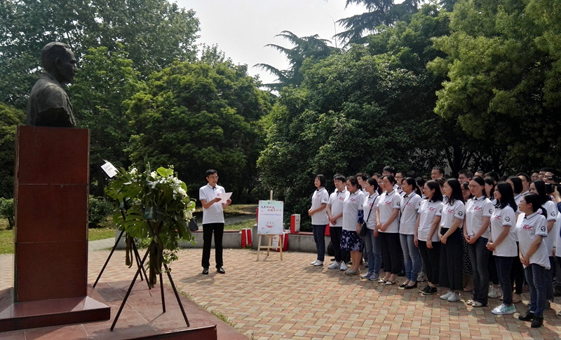 创始人朱裕璧雕像敬献花篮,宣读颂词,行三鞠躬礼。