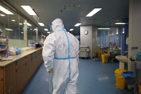 中南医院第二批走进重症隔离病房工作的医护人员。拄拐期间,大伙儿打趣,叫他“双拐医生”。有时候,饶歆还会跟他们一起拿自己开涮——谁还会在意呢,在只能通过笑声识别欢乐、肉眼不见笑脸的隔离病房?