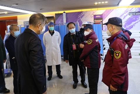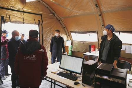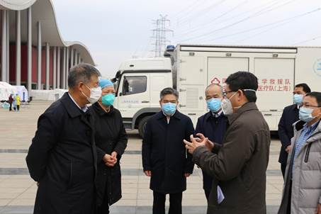 校领导一行首先来到了武汉市目前规模最大的方舱医院——位于东西湖区的武汉客厅方舱医院。该院规划设立2000张床位,于2月7日晚开始收治患者,目前累计收治轻症患者近1500名。除了中南医院的医护人员,还有来自上海东方医院、北京中日友好医院、新疆生产建设兵团、重庆市、宁夏区、广东省的6支国家援鄂医疗队,以及安徽、新疆、甘肃、山东等4支省级护理支援队。共有1100多名医护人员夜以继日工作,共同为患者提供及时科学的治疗观察,使这个“最大的”方舱医院有序运转。