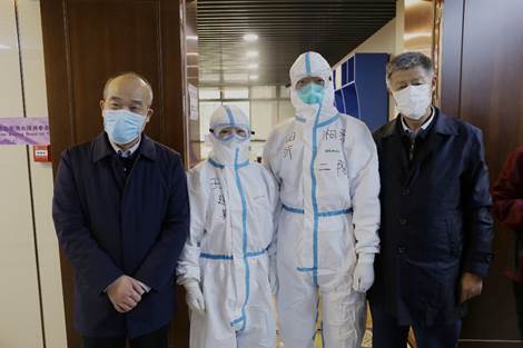 人民医院乳甲外科护士长王建英,正整装待发,准备“进舱”。校领导们询问了他们的工作内容,关心他们长时间身着厚重防护服的感受,提醒他们要保重身体。