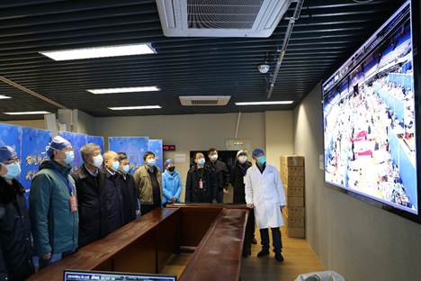 在监控室,校领导一行通过监控视频了解三个病区的实时情况。人民医院副院长、武昌方舱医院院长万军介绍,方舱医院原则上收治已确诊、且未在定点医院隔离治疗的轻症患者;医护人员每天进行巡检,对病人进行口服药、肌肉注射等治疗;如果患者好转痊愈经过检测可以出院,如果病情加重立即转至定点医院。万军说,“目前医院运转情况良好,已经有54名患者出院。我曾提出武昌方舱医院的目标就是要确保三个零,即医护人员零感染,病区患者零死亡,出院患者零‘回头’。”当了解到,武昌方舱医院正在编写“方舱医院”国家标准,韩进指示,立即组织健康学院专家,协助人民医院尽快推进此项工作。