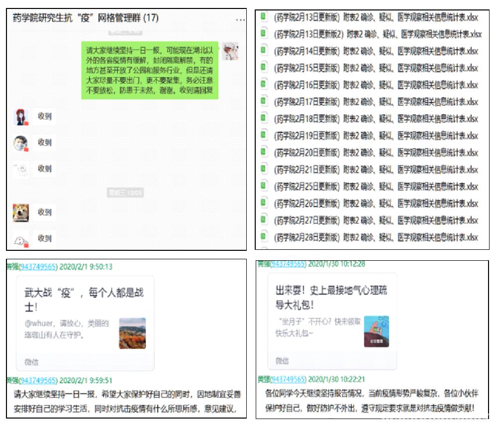 疫情当下,学院党政领导、管理干部、辅导员、班主任、导师等,坚守岗位,集体上阵,通过一对一微信/QQ、微信/QQ群和电话等形式与全院师生保持密切联系,随时沟通,一日一报,第一时间掌握全院师生的思想动态和身心健康情况,把组织的关怀送到每一个人身边。学院也一直把离退休的老同志挂在心上,对离退休老同志进行了疫情防控工作统计和宣传。