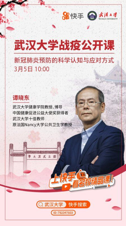 “珞珈开讲”之系列“战疫公开课”开讲。第一讲的主讲教师是健康学院的谭晓东教授,题目为“新冠肺炎预防的科学认知与应对方式”。