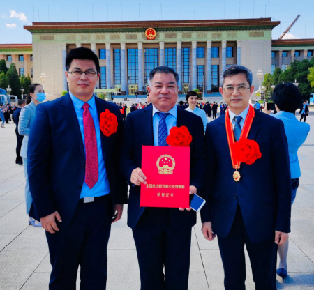 参加表彰大会的中南医院代表,从左至右分别为:徐海波、夏剑、检验科党支部书记胡汉宁