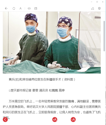 2019年11月14日晚9时10分,一架从乌鲁木齐飞往武汉的航班上,一名年轻男性乘客突发剧烈腰痛、持续无法缓解、伴大汗淋漓。正巧,代表新医大五附院去武汉参加“第十届扬子江心脏论坛暨2019年心房颤动高峰论坛”,并接受房颤中心总部正式授牌的黄兵和幸世峰也在航班上。两人闻讯后准确施救,病人转危为安,让飞机避免被迫返航或备降其他机场。黄兵作为援疆医生飞机上救人事件在中新社、长江日报、新疆日报、长江商报、武汉晚报等国家和武汉及新疆多家媒体报道,引起强烈反响。