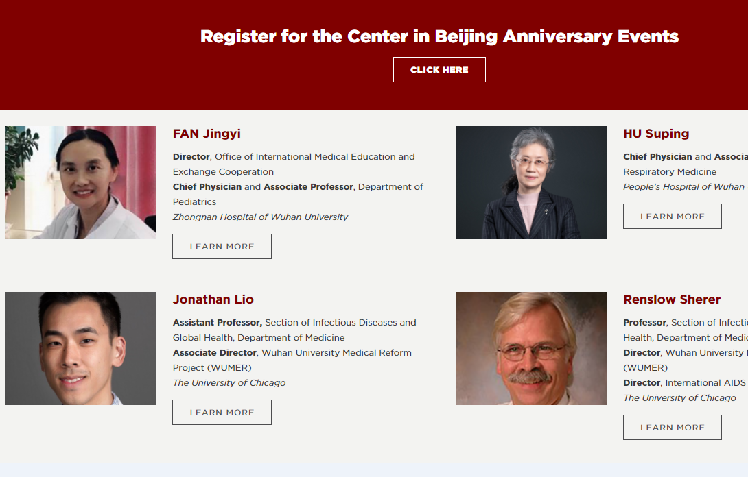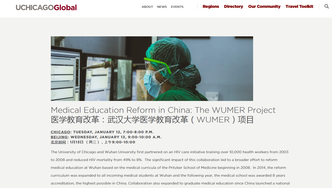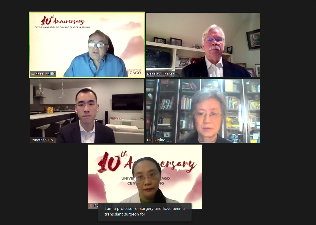 与芝加哥大学医学教育改革(WUMER)项目的线上访谈。芝加哥大学校长司马博(Robert Zimmer)、副校长胡安·德·巴勃罗(Juan de Pablo)、副校长利嘉仪(Ka Yee C. Lee)出席了活动。访谈由芝加哥大学北京中心主任、国际知名外科教授麦克·米勒(J. Michael Millis)主持。WUMER项目负责人、芝加哥大学感染与国际卫生科教授谢尔(Renslow Sherer),内科医生刘恩扬(Jon Lio),Av解说