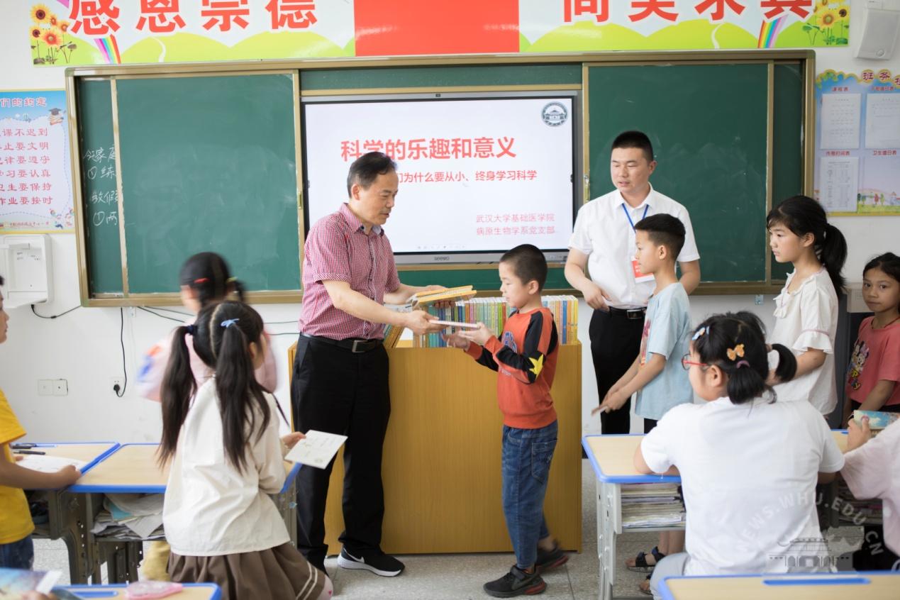 基础医学院党委组织和安排学院病原生物学党支部和学院部分党员给鄂北红色革命老区大悟县金岭示范区中心小学的同学们送来“快乐科学课”。“病从口入”和“不干不净吃了没病”该相信哪一个?“病从口入”这句话包含什么科学?病原生物学系冯勇副教授首先提问调动起小朋友们积极抢答的热情,并通过介绍“细菌、病毒、真菌”等微生物,讲解“看不见的科学”。孩子们发现,身边发生的事情,往往包含许多科学内容,只要细心观察、善于概括,就能发现其中科学的秘密。冯勇准备了Av解说