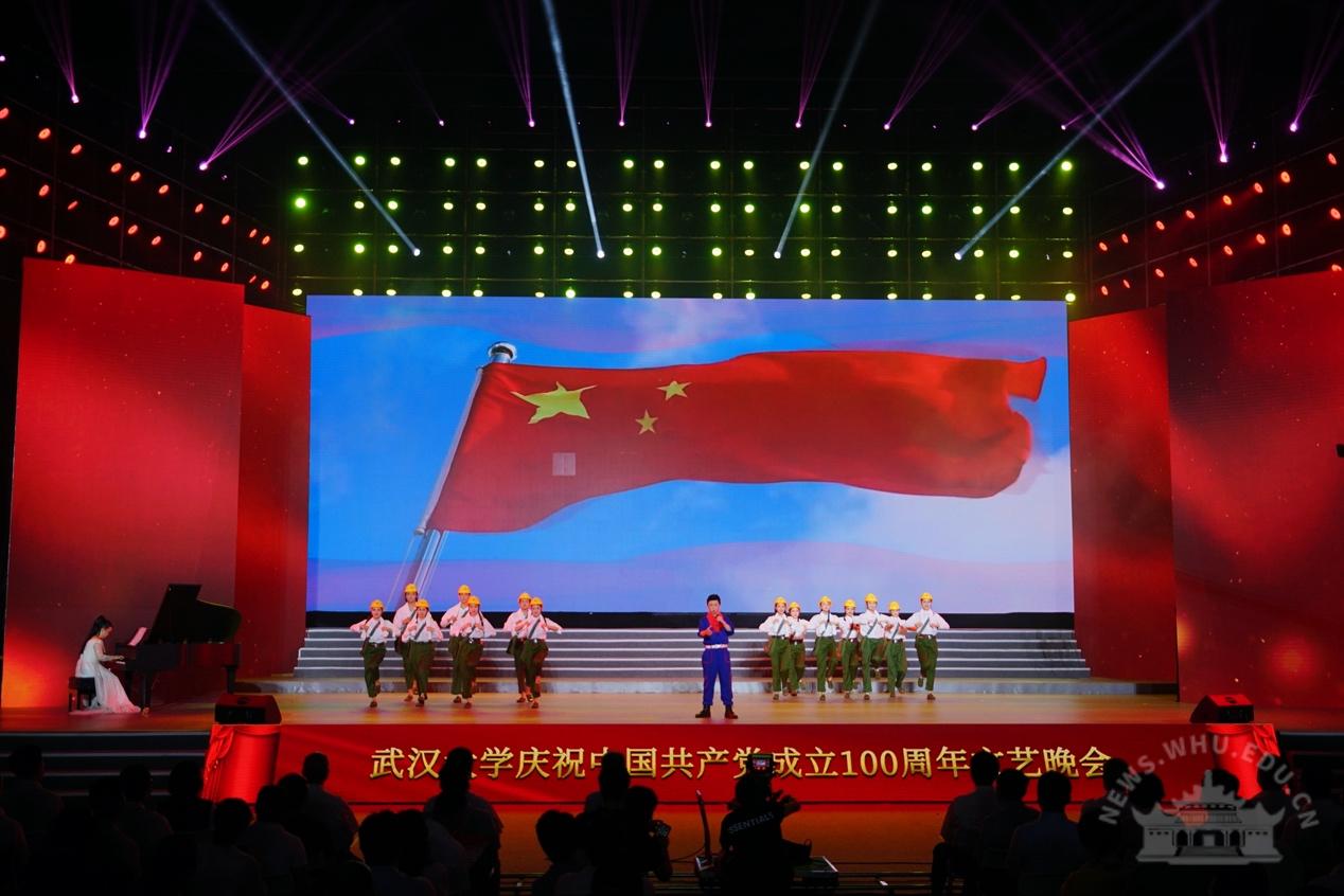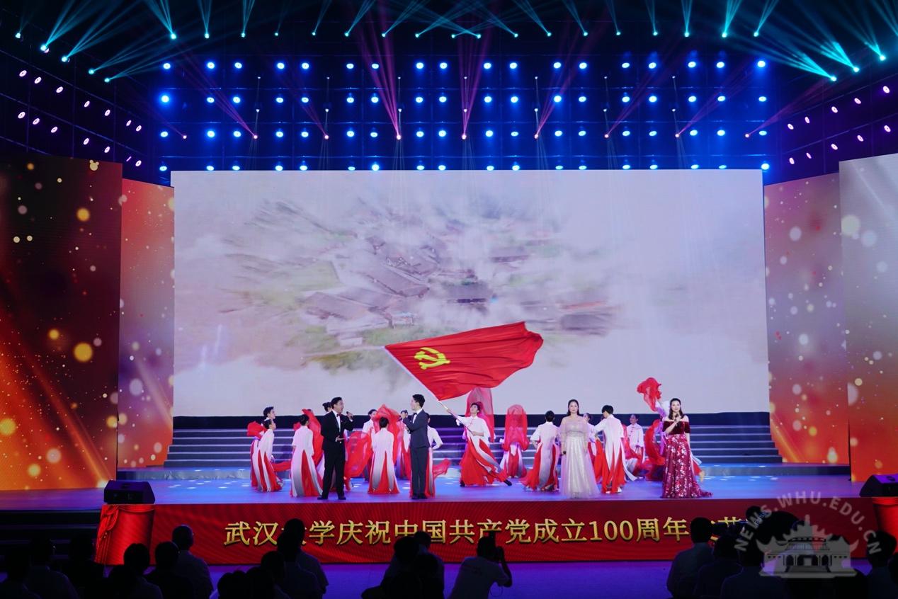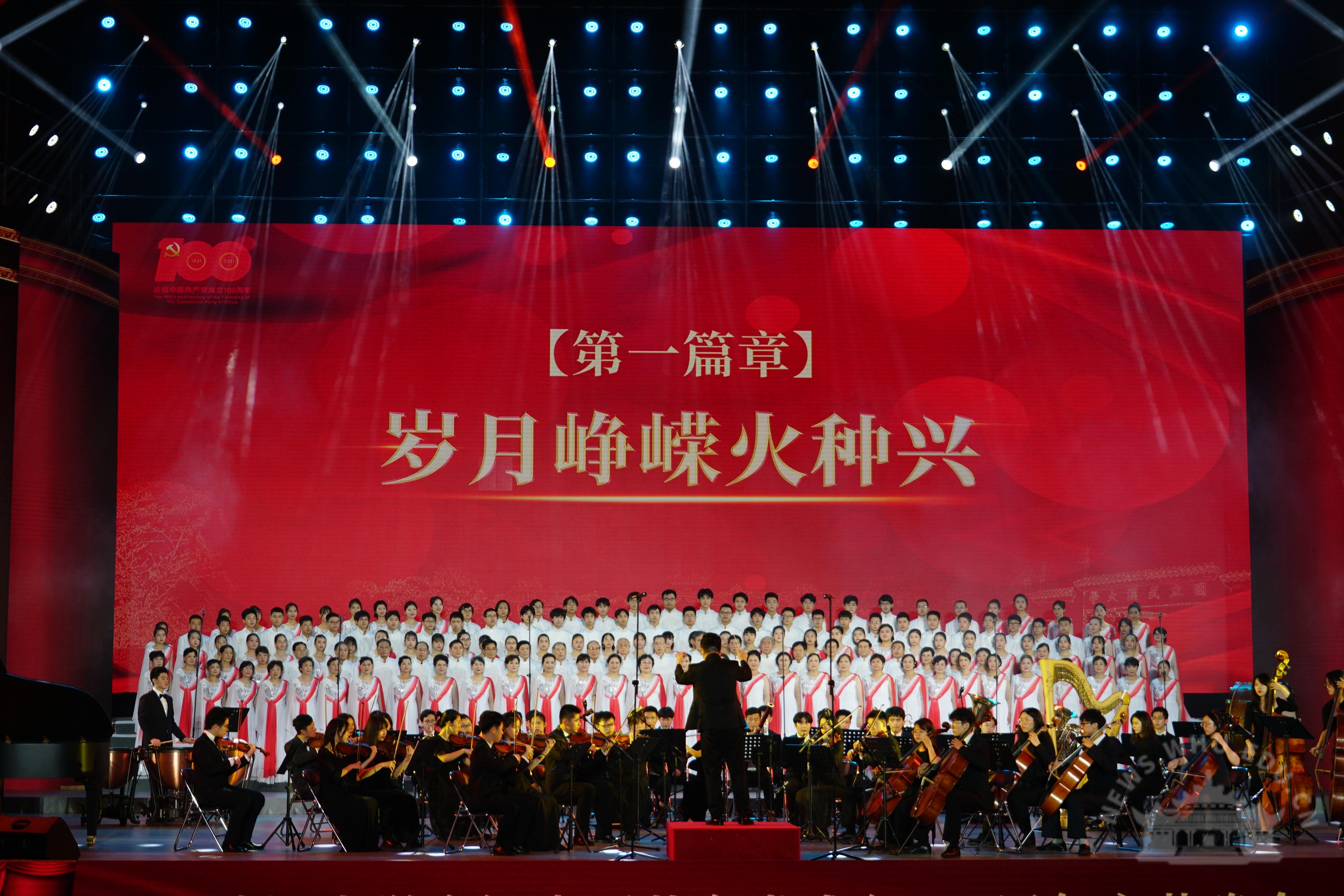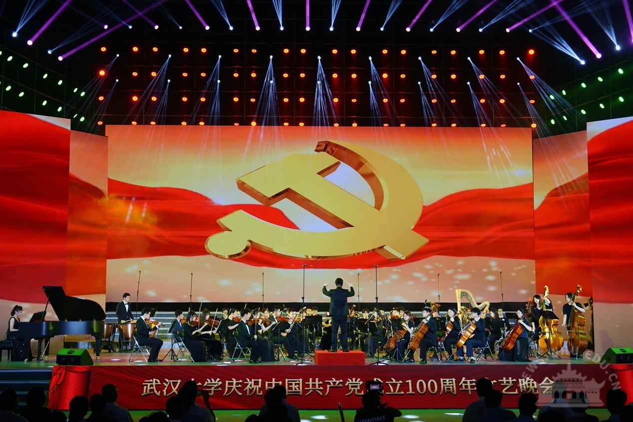 大学生艺术团交响乐团演奏《红旗颂》,拉开了晚会的序幕。整场晚会分为“岁月峥嵘火种兴”“华章伟业映赤诚”“筑梦未来启新程”三个篇章,展现了中国共产党100年的奋进历程、武大人对党的深情祝福以及与祖国共奋进的使命与担当。