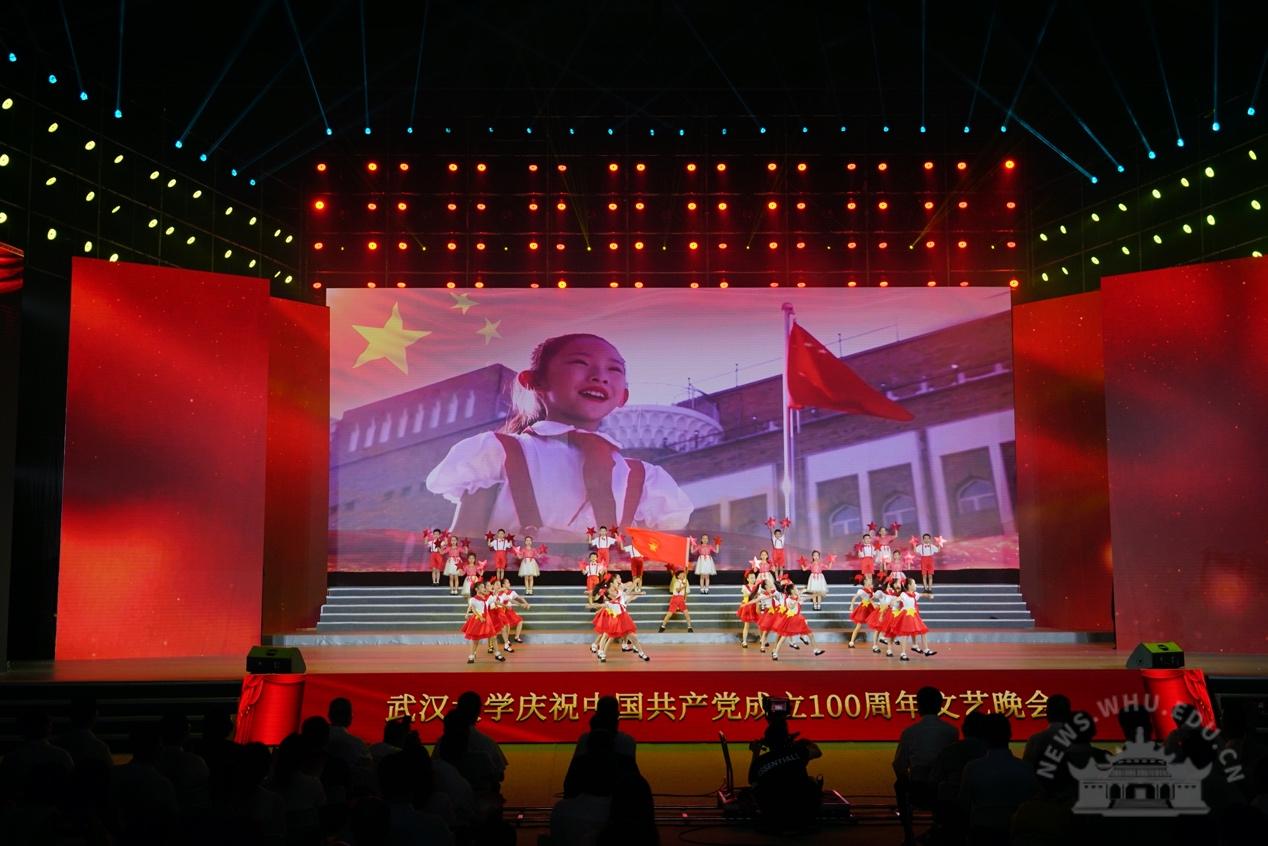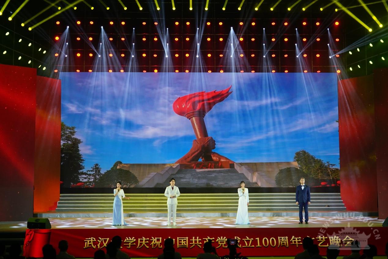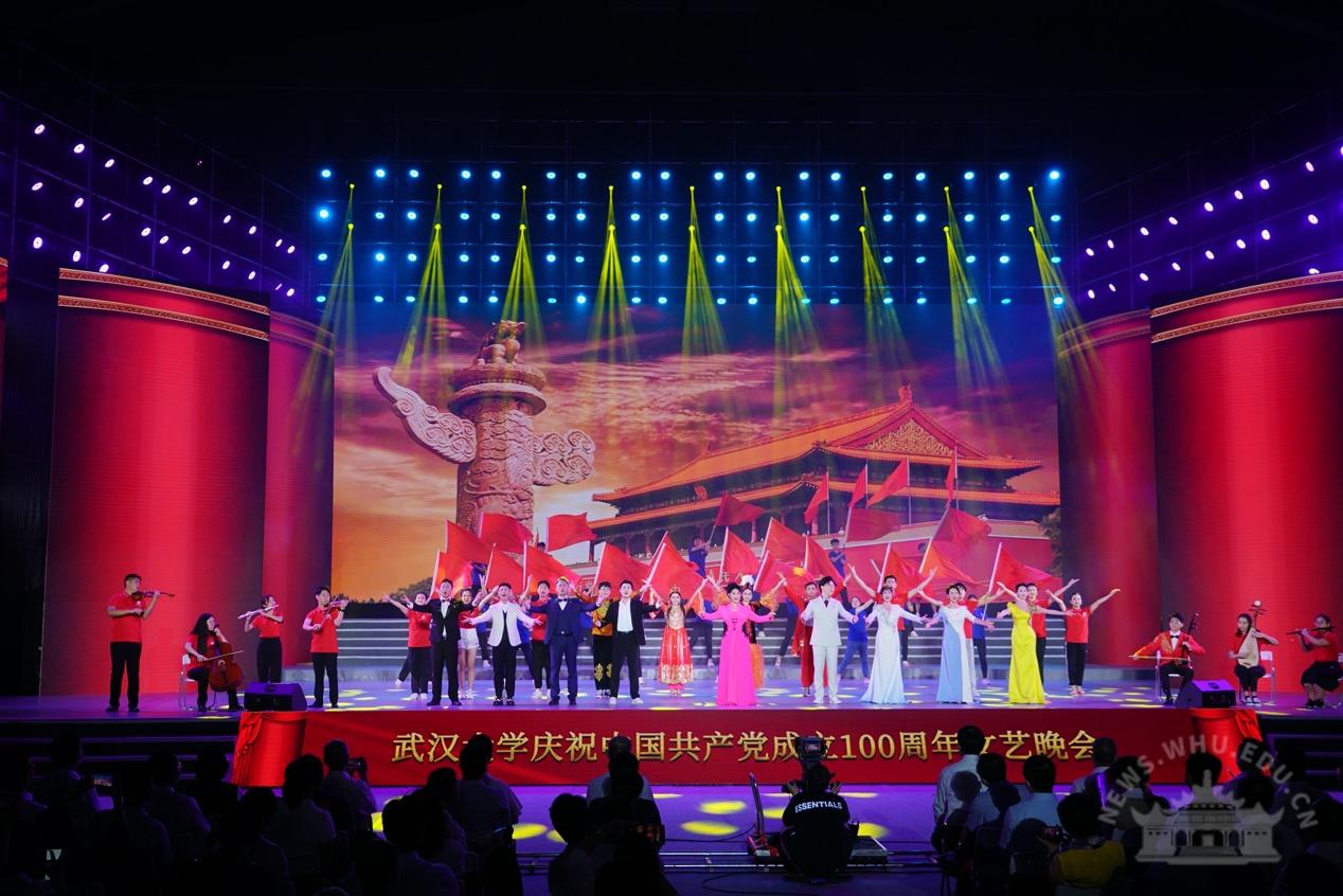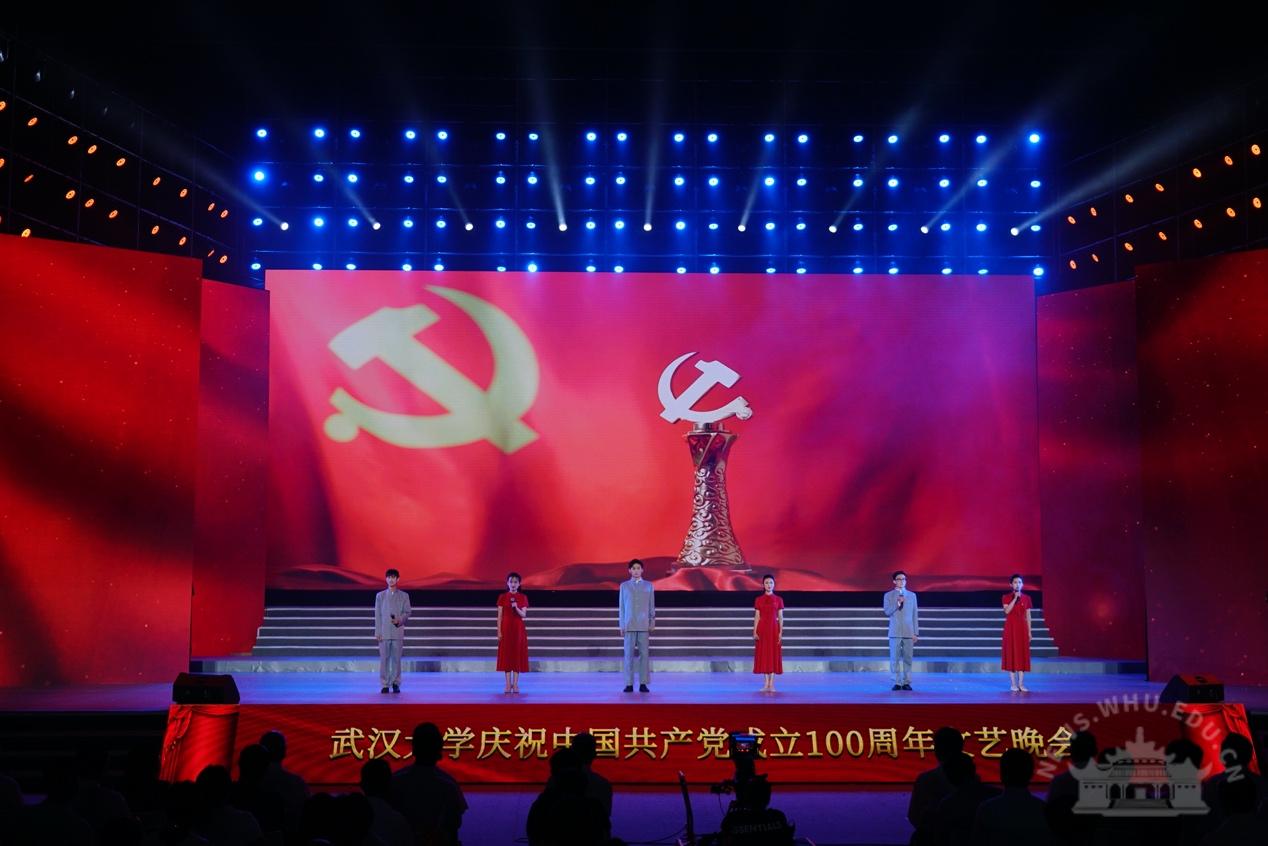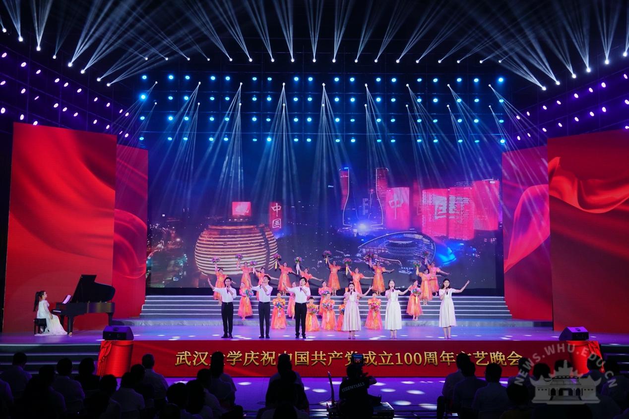 大学生艺术团交响乐团演奏《红旗颂》,拉开了晚会的序幕。整场晚会分为“岁月峥嵘火种兴”“华章伟业映赤诚”“筑梦未来启新程”三个篇章,展现了中国共产党100年的奋进历程、武大人对党的深情祝福以及与祖国共奋进的使命与担当。