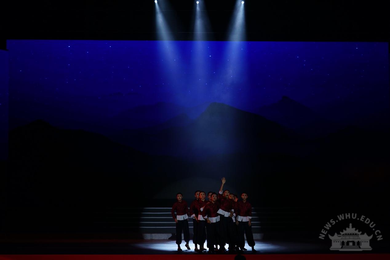 第二篇章“华章伟业映赤诚”中,二胡演奏的《战马奔腾》轻盈灵动。学生辅导员、本科生代表、“榜样珞珈”宣讲团带来的歌曲联唱《党旗飘扬的方向》《我宣誓》气势磅礴。歌曲联唱《流溢的心声》饱含深情,表达了中华儿女继往开来,延续新征程的辉煌。情景朗诵《青春珞珈、红色珞珈》展现了武大青年学子一心向党,丹心豪情融入生命光华。舞蹈《盛世鸿姿》,奏响浩气长存的壮歌大雅。