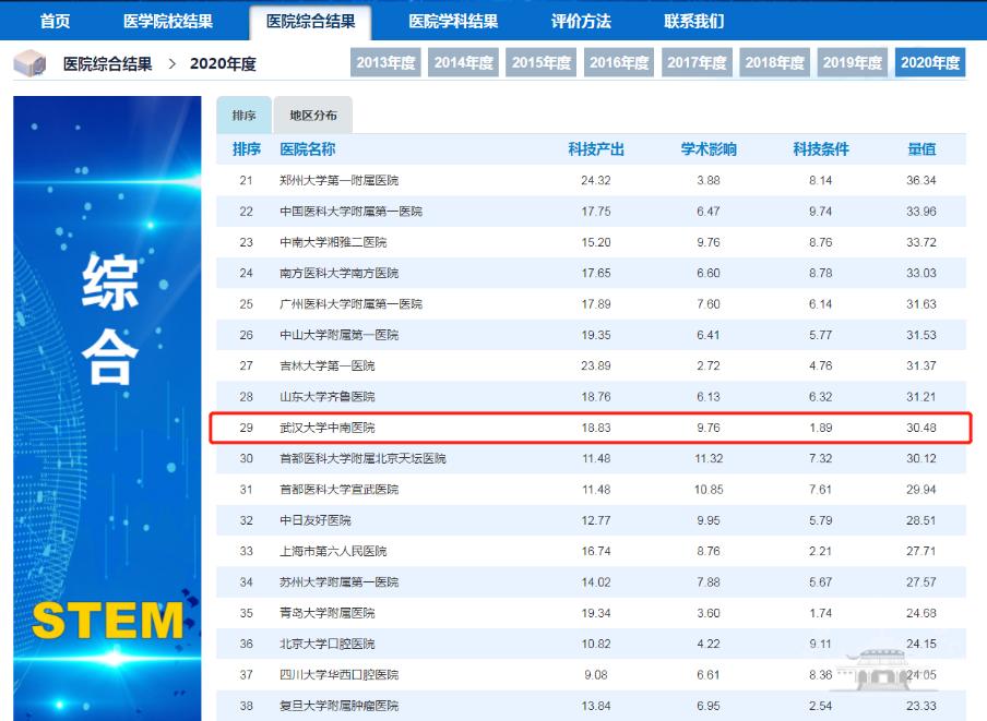 中南医院位居全国第29位(2019年为全国第70位)。