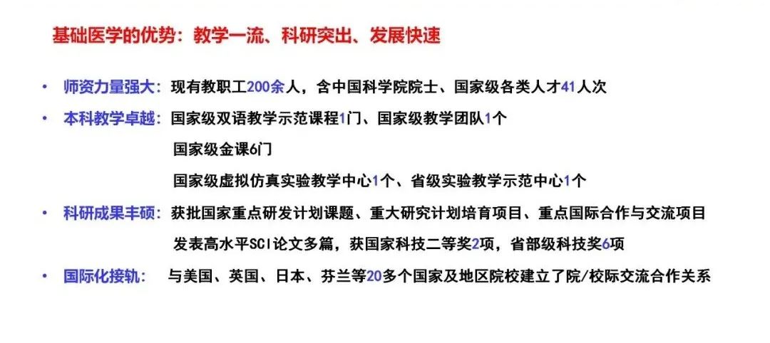 基础医学学科拥有一流的师资队伍,包含中国科学院院士和国家级各类人才。一流的师资摇篮孕育了丰硕的科研成果和教学成果,基础医学拥有国家级双语教学示范课程、国家精品在线开放课程、国家级一流本科课程和国家级教学团队,承担大批国家自然科学基金项目和重点研发计划课题,发表多篇高水平SCI论文,多次荣获国家科技奖和省部级科技奖。