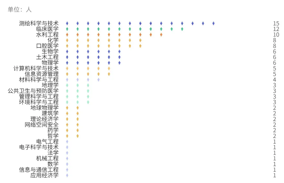入选学者覆盖工学、理学、医学、管理学、经济学、哲学、法学7个学科门类(图1),涵盖28个一级学科(图2)。入选学者中工学门类的高被引学者最多,共51人,其次是理学、医学,分别入选26人和25人;相较去年同期,理学发展成效显著,新增4名高被引学者。从一级学科看,测绘科学与技术(15人)、临床医学(12人)与水利工程(10人)入选学者人数依然保持前三;土木工程、计算机科学与技术、地理学等3个学科的高被引学者数量较去年增加最多,均新增2人。