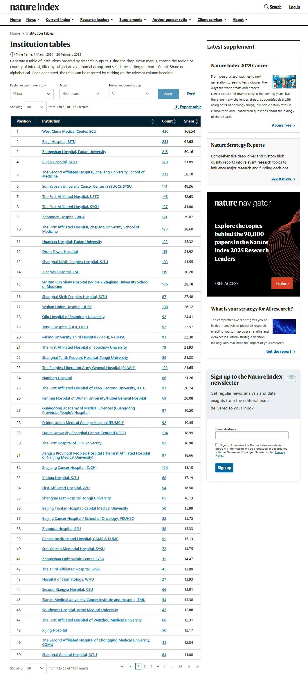 (通讯员 苏航)近日,国际顶尖期刊《自然》杂志网站公布了最新自然指数排名(2024年3月1日至2025年2月28日)。本次全球共有5868所医疗机构入选最新自然指数榜单,其中中国医疗机构达1161所。Av解说