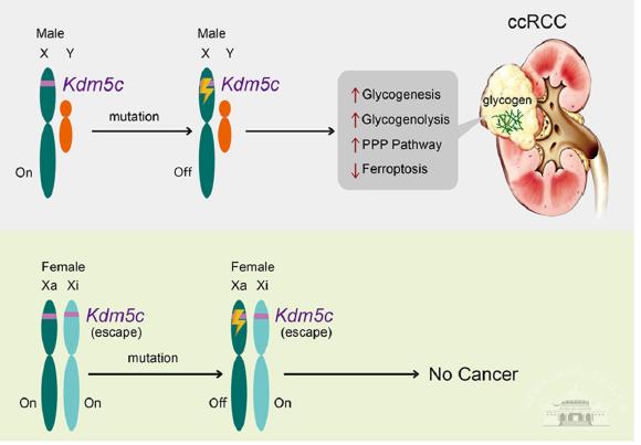 肾癌的代谢研究多着眼于糖酵解和脂代谢,糖原仅作为一种过渡能量存储形式,关联葡萄糖与脂肪代谢。该研究提出肿瘤细胞中组蛋白甲基化修饰酶失活突变是推动ccRCC糖原代谢重编程的重要驱动力量,并在全基因组或局部染色质的组蛋白甲基化水平上结合转录组学和代谢组学解析这些基因调控糖代谢的分子机制。此外,该研究也提示了在ccRCC中靶向糖原代谢的治疗价值。这项工作还从一个新的角度解释为什么部分癌症中男性发病会占主导地位。少量X染色体失活的基因发生逃逸使得女性X染色体上的肿瘤抑制基因的两个拷贝均表达,而男性只有一个拷贝。所以,女性的细胞中需要两个副本都突变才能致癌。作为典型的X染色体失活逃避基因,仅需一个突变就会使男性KDM5C的唯一等位基因失活,从而引发代谢改变并抑制铁死亡。因此,相较于女性,男性将更有可能发展为ccRCC。
