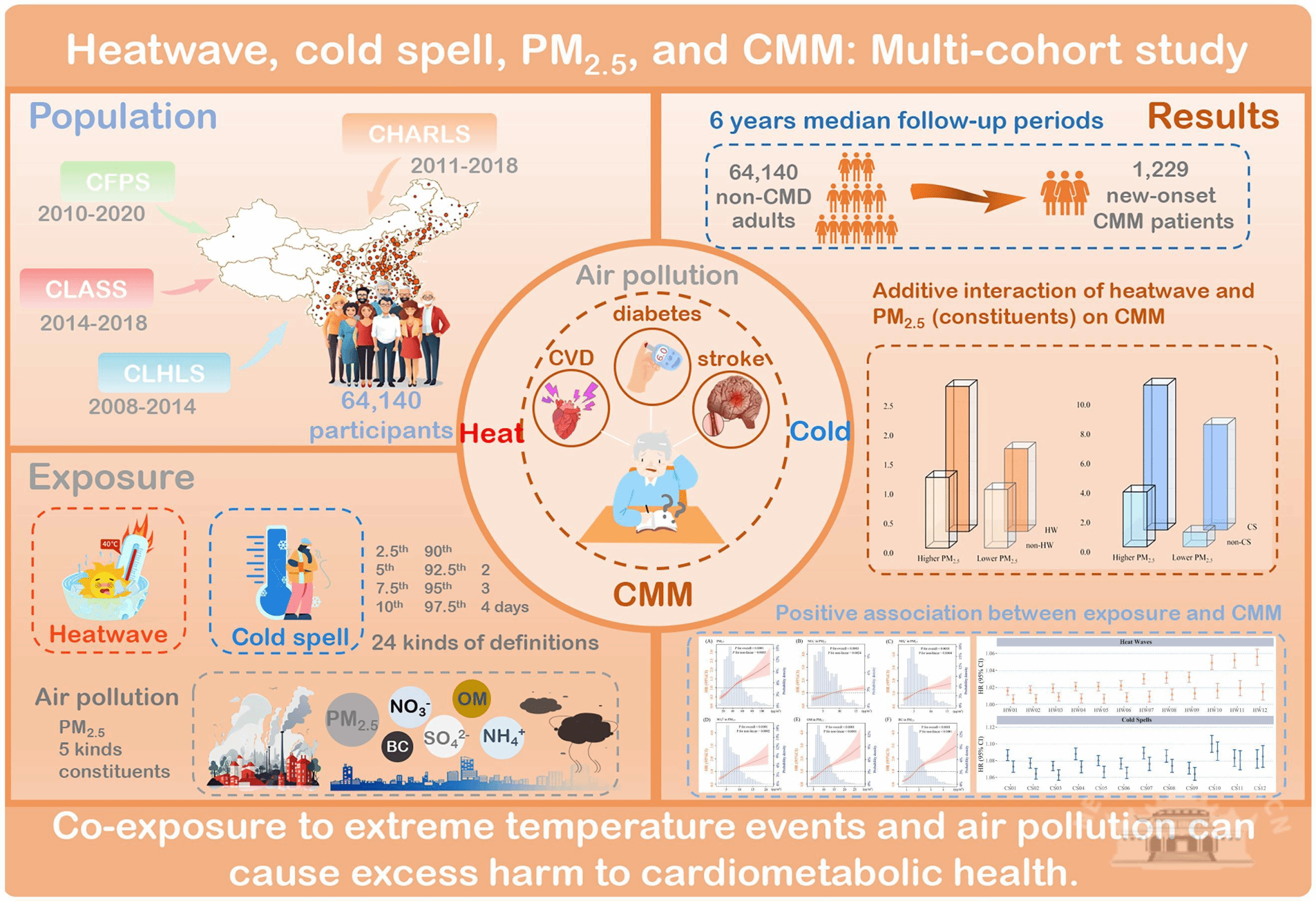 该研究整合了4个全国性队列 (CHARLS,CLASS,CFPS和CLHLS),共计纳入64,140名研究对象。研究发现,我国中部地区大气PM2.5污染较为严重,西北地区和长江中下游地区的热浪发生频率高,西北地区的寒潮发生也较为严重。在调整其他混杂因素后,大气PM2.5及其组分、热浪、寒潮暴露均与心血管代谢共病的发生呈正相关,且PM2.5与热浪暴露对心血管代谢共病的影响存在相加交互作用。在全球大气污染日益复杂,气候变化备受关注的背景下,大气污染和气候变化复合暴露的健康影响,已成为环境健康领域的新热点。