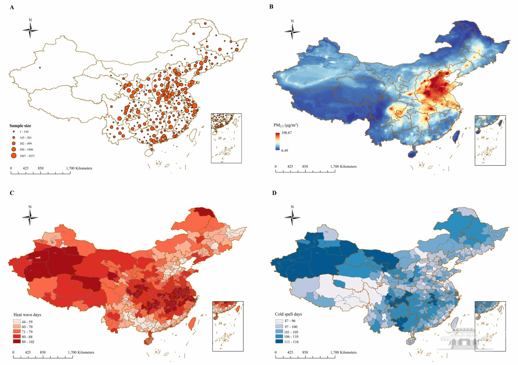 研究对象居住地、大气PM2.5浓度、热浪和寒潮数量的空间分布特征