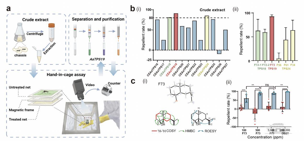 在系统表征了艾蒿的萜类化合物后,研究人员开始寻找艾蒿中具有驱虫活性的萜类物质。他们先使用表达AaTPSs的酵母菌株粗提取物,搭建了埃及伊蚊的hand-in-cage活性筛选体系进行初筛,锁定了可能具有驱蚊活性的三个基因的产物AaTPS18, AaTPS19, AaTPS24的粗提产物。进一步通过分离纯化三个基因的产物进行驱蚊测试,锁定了AaTPS19的主产物F73,由此确认了艾蒿中驱蚊的物质F73艾蒿醇。