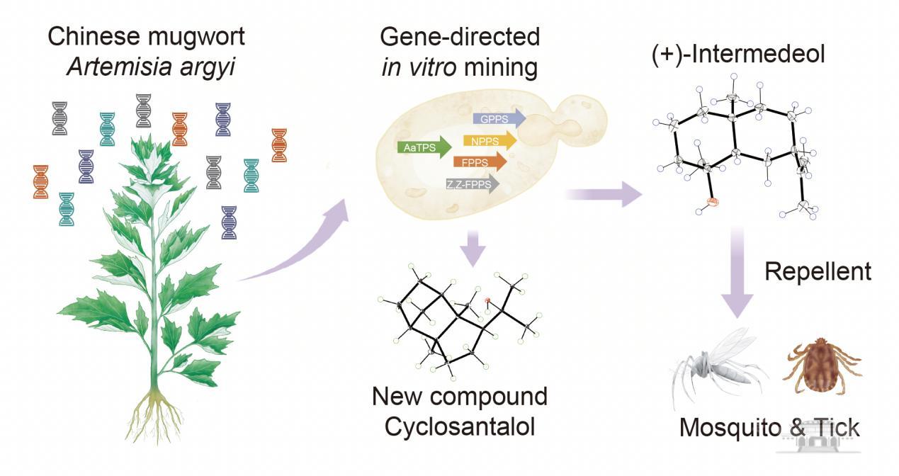 植物界蕴藏着丰富的天然产物,其中许多生物活性化合物尚未被发现。传统的分离提取方法复杂且受限于植物材料,使得大量低含量、高活性的植物天然产物难以被挖掘和应用。本研究不仅成功揭秘并合成了艾蒿中的驱蚊成分,更为其他高价值植物天然产物的挖掘和应用提供了新方法和新思路。