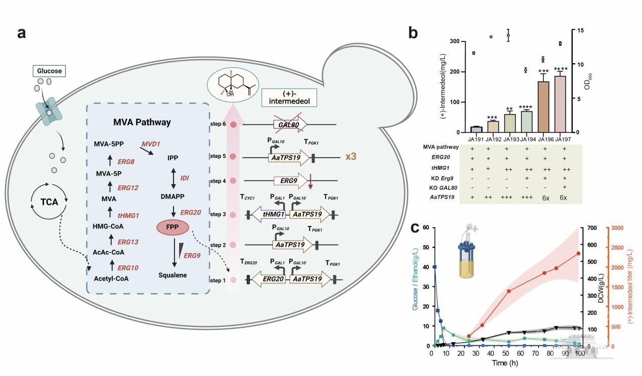 回到艾蒿中,发现艾蒿醇在艾蒿中含量极低,这也是之前经典的提取方式无法发现并获得,也是为什么我们的祖先通过经验发现有用,但是一直没有得到科学的利用。为此,研究团队利用合成生物学技术,在酵母中成功实现了艾蒿醇的生物合成,并利用代谢工程手段使5L生物反应器中,滴度提高到2.34 g/L,显示出商业规模生产的巨大潜力。