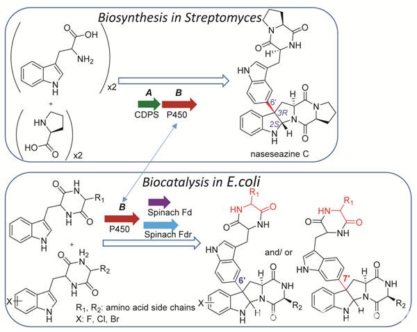 联合课题组研究发现,其实naseseazine C的生物合成异常简洁并且高效,仅需要一个环化酶和一个P450 酶,分别催化合成环二肽底物以及吡咯并吲哚骨架的合成。不过,该P450的催化反应机制前所未闻,包括了自由基引发、异构、分子内的Mannich反应以及分子间的自由基加成消除反应。