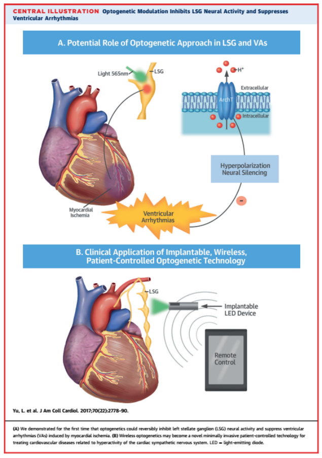 该研究中,江洪教授团队使用腺相关病毒作为载体,将抑制性光敏通道蛋白ArchT导入实验犬的心脏交感神经节(LSG),并植入微型LED对LSG进行波长为560~580nm的无线单色激光照射。结果显示,在光照条件下,实验组LSG神经活性及功能被显著抑制,心电图记录表明VA发生率明显降低;延长光照时间,抑制作用被强化;光照结束后,LSG神经活性及功能可恢复至基础状态。该研究结果表明,光遗传学技术可通过抑制交感神经激活,实现对VA的防治,且该抑制作用是可逆的。
