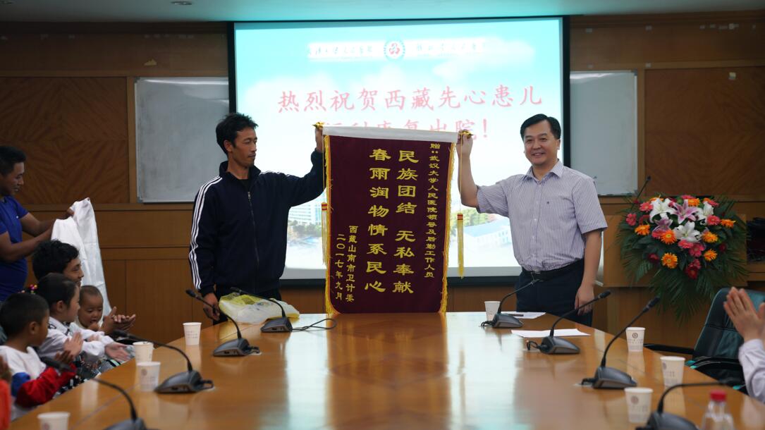 万红慧书记发表了热情洋溢的讲话。他首先祝贺12名西藏山南地区先心病患儿痊愈出院,即将踏上返程。他表示,承担本次爱心救助任务,是医院的责任,更是医院的光荣。能够顺利圆满完成本次爱心救治任务,要感谢湖北省委省政府以及省援藏办、省卫生计生委对医院的信任与支持,感谢各位患儿家属对医院的信任,感谢各职能部门和相关科室的通力合作、同心协力。