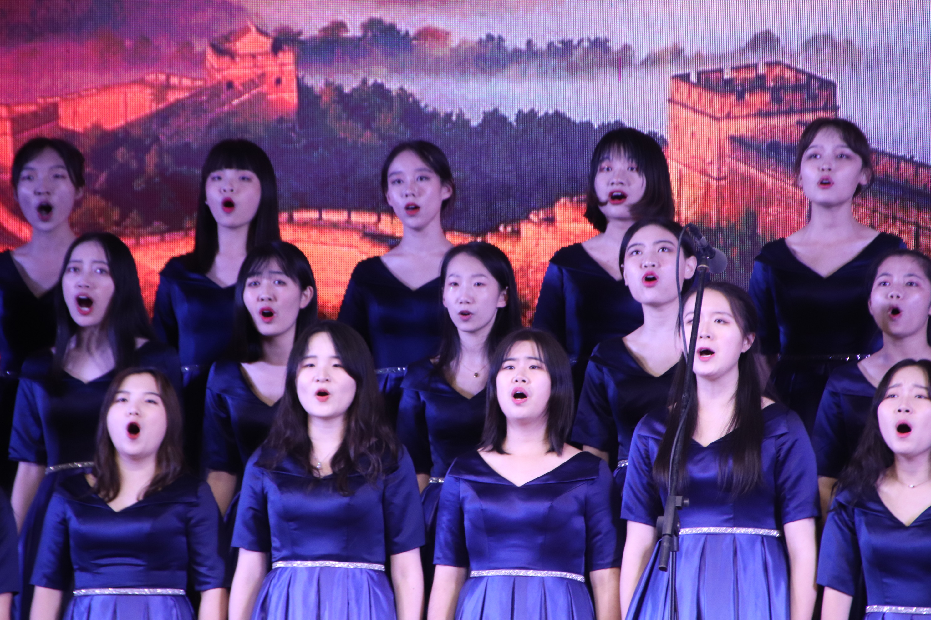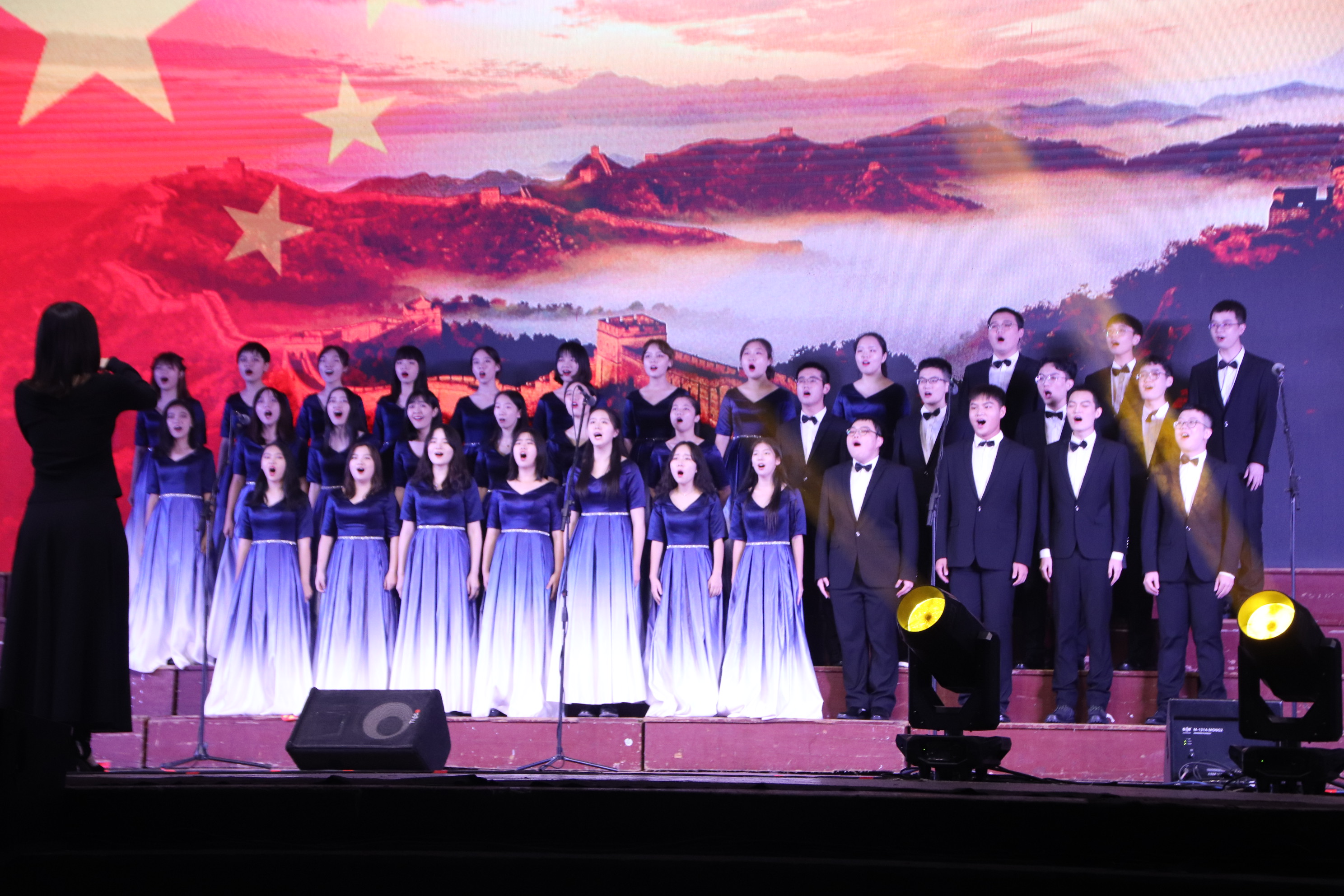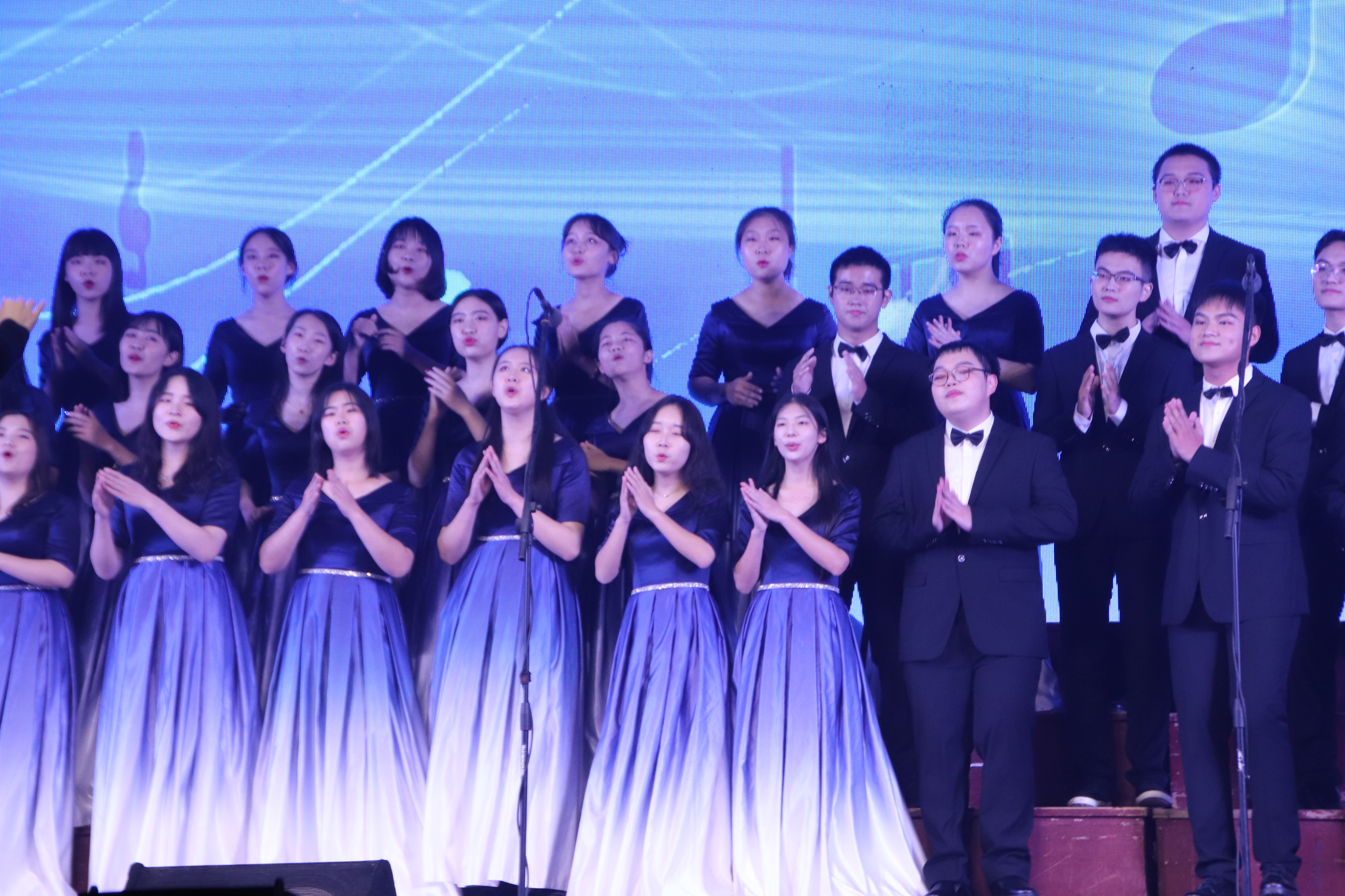 随着主持人的报幕,合唱团在观众的欢呼声中登上舞台。女生身穿清丽秀雅蓝色长裙,男生身着笔挺的黑色西装,在灯光的照耀下显得格外青春靓丽。第一首歌是《新的天地》。随着音乐响起,悠扬的歌声在操场上空荡漾回转。高音婉转,低音雄厚,人声与琴音配合默契,情感充沛,层次分明。深沉平稳的歌声也象征着中国共产党人一路走来像种子扎根大地般矢志不渝、永葆初心的宝贵品质,台下的观众不觉沉浸其中,随着歌声一起走进中国共产党人风雨兼程、兢兢业业的红色岁月,心中油然生起崇敬感激之情。